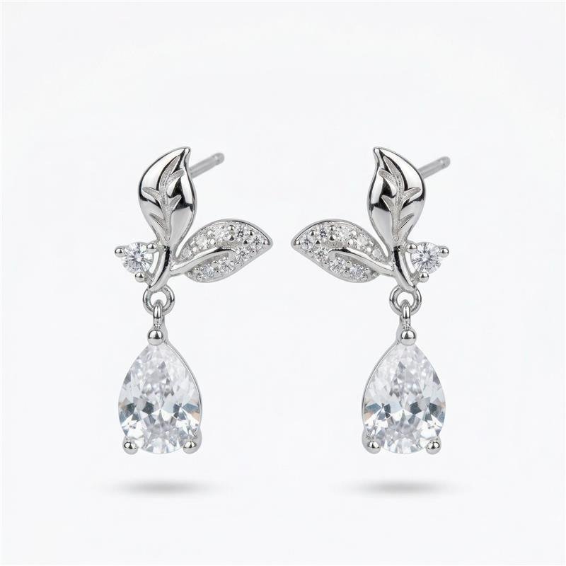 Brinco em Prata 925 apresenta um design botânico com delicadas folhas cravejadas e lisa, finalizado por uma elegante gota de zircônia. Com banho de ródio, oferece um brilho prateado vivo e proteção extra para uma joia eterna e sofisticada.