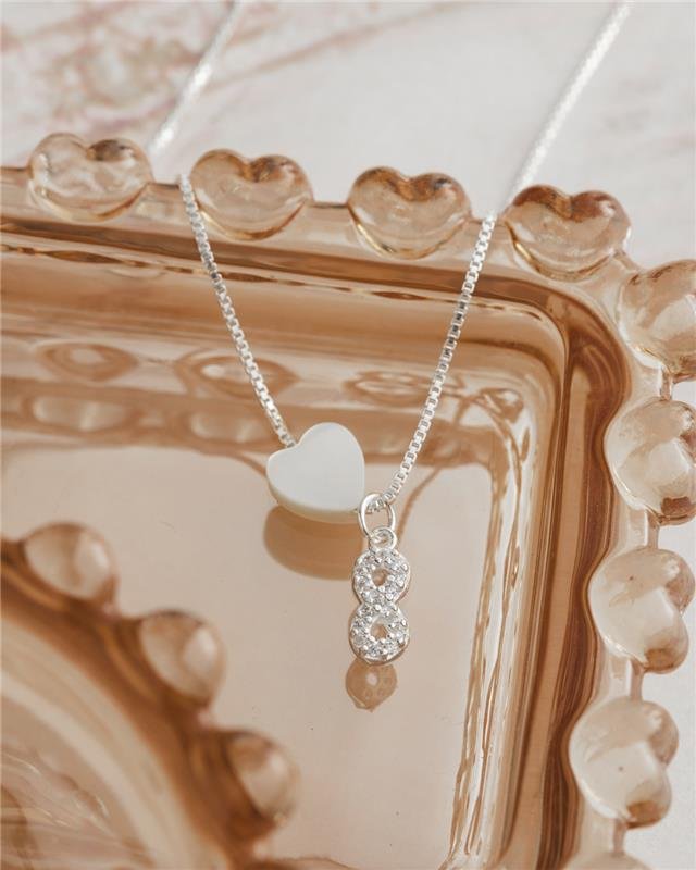 Delicado e sofisticado, este colar traz um pingente de coração em madrepérola, simbolizando pureza e sentimentos verdadeiros, combinado ao símbolo do infinito cravejado com zircônias, representando amor eterno e conexões que transcendem o tempo. Uma joia atemporal, perfeita para presentear ou eternizar momentos especiais.