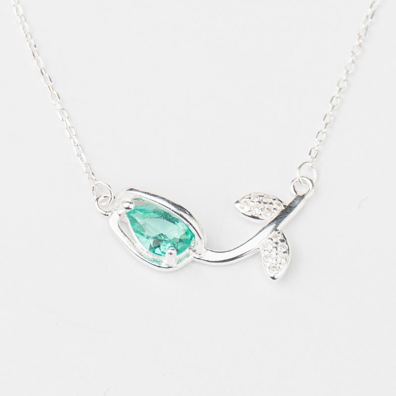Peça delicada e encantadora, este colar em prata traz um design único em forma de flor, com uma pedra central que pode ser cristal, rosa ou verde em formato de gota que simboliza beleza e feminilidade. O caule curvado e as folhas adornadas com microzircônias brilhantes conferem um toque de sofisticação e leveza à peça.