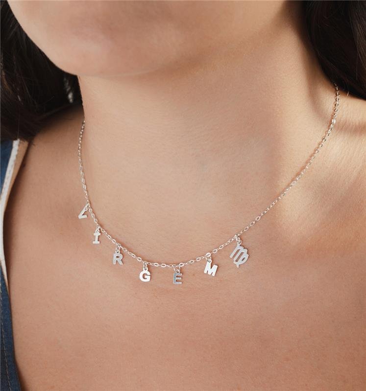 Colar delicado com pingentes de letras formando a palavra “VIRGEM” e símbolo do signo. Uma peça autêntica que expressa a elegância e a precisão das virginianas.