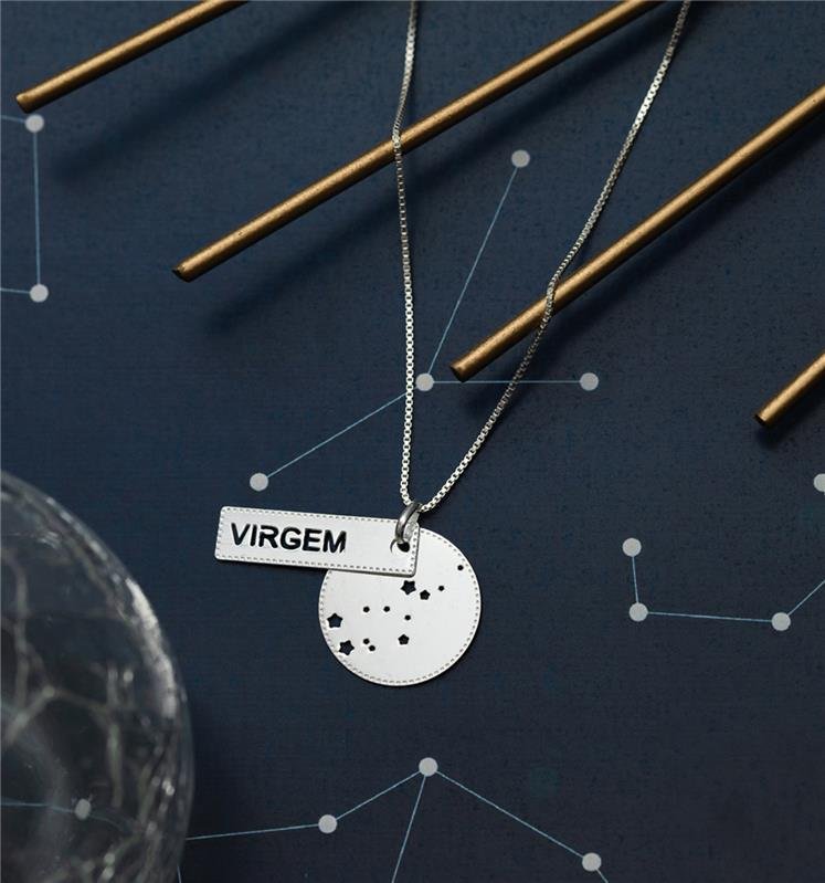 Pingente duplo com plaquinha vazado o com nome “Virgem” e disco com a constelação do signo vazada. Um acessório discreto e sofisticado, ideal para quem valoriza organização e perfeição.