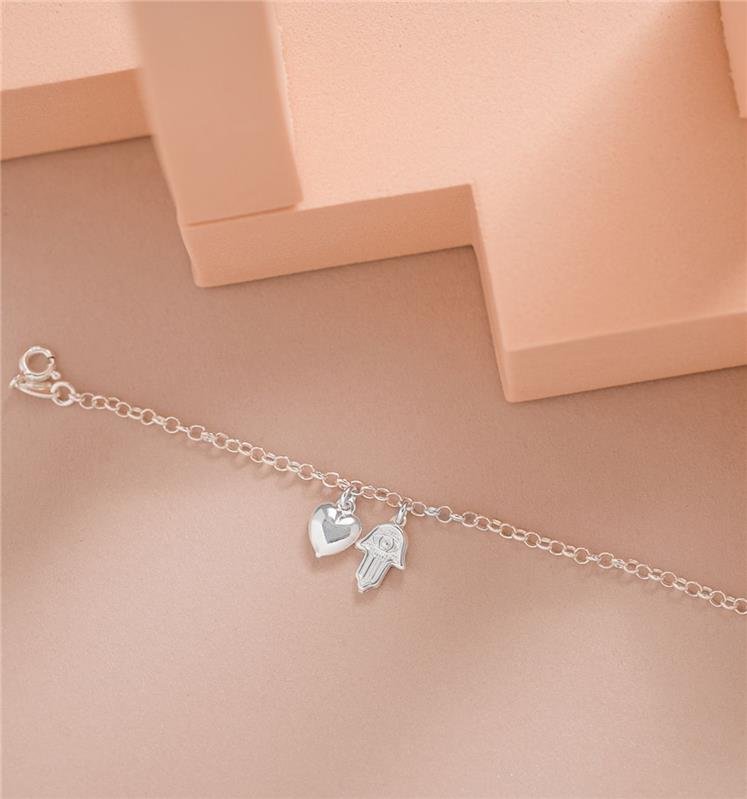 Peça confeccionada em prata 925 e traz dois pingentes simbólicos: o coração, que representa amor e afeto, e Hansá, conhecida como símbolo de proteção, boas energias e sorte.